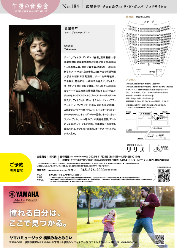 午後の音楽会 第184回 武澤秀平 チェロ、ヴィオラ・ダ・ガンバ ソロリサイタル